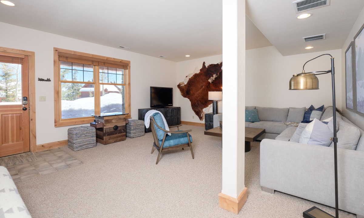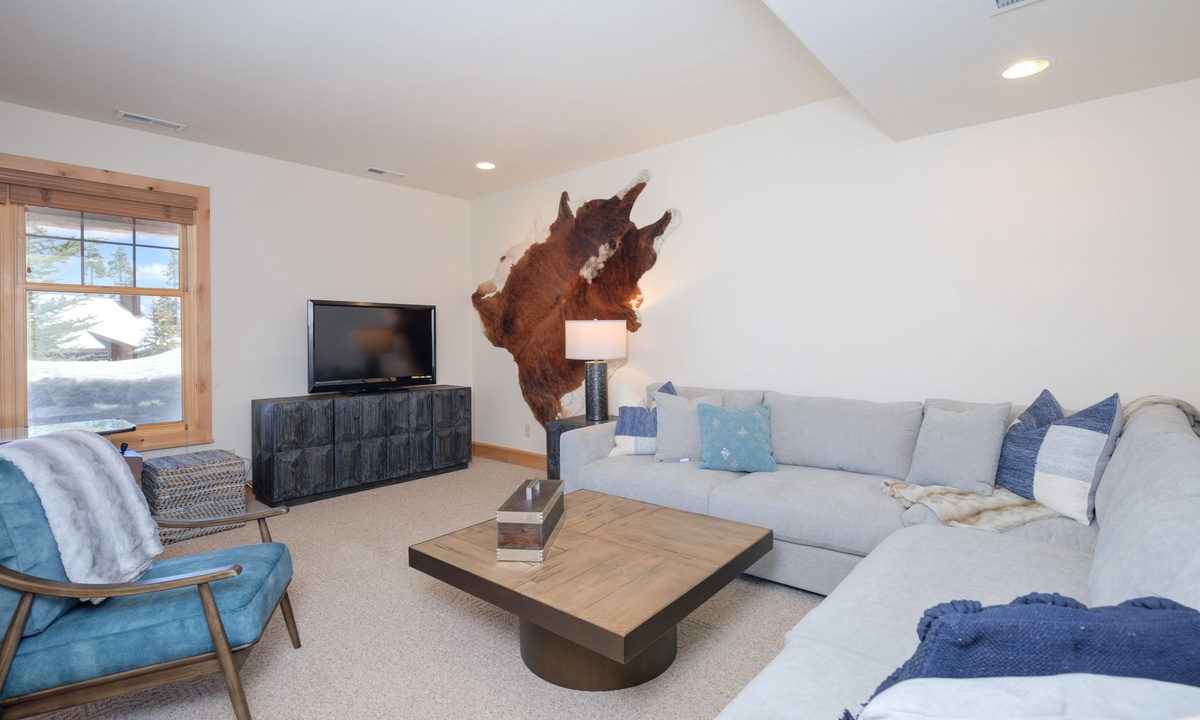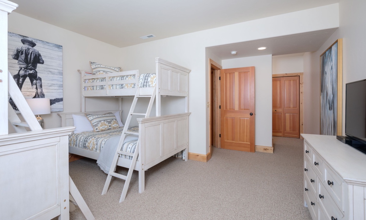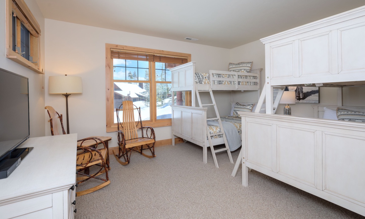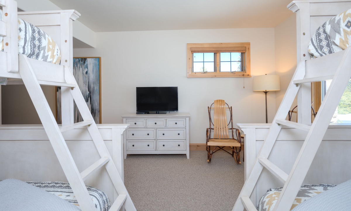Upstairs in the loft room you’ll find a seating area, small desk (if remote work is needed) and a king en-suite bedroom. Downstairs on the lower level of the home is a bonus family and TV room, a spacious bedroom with two queen bunks and access to a covered deck with a soothing hot tub overlooking the evergreens.