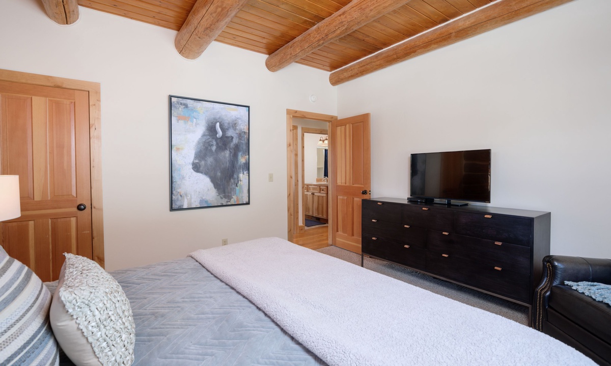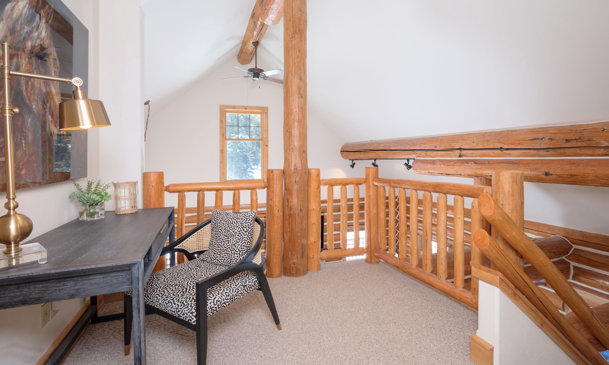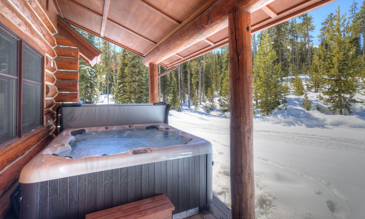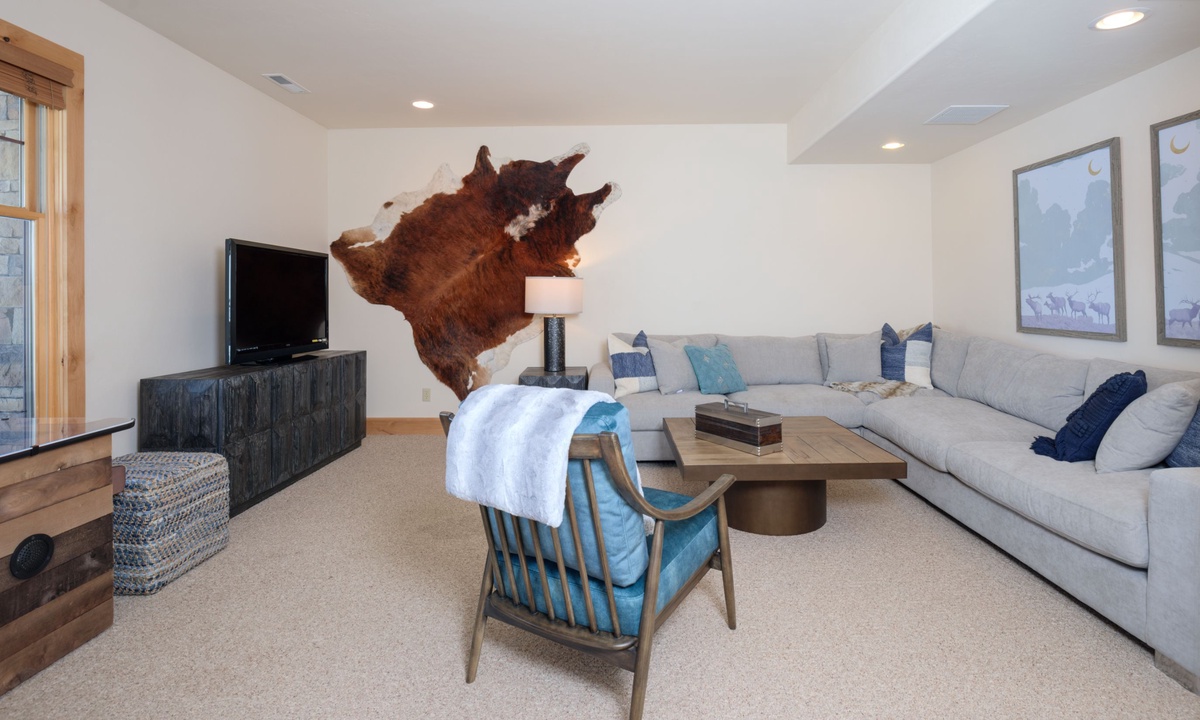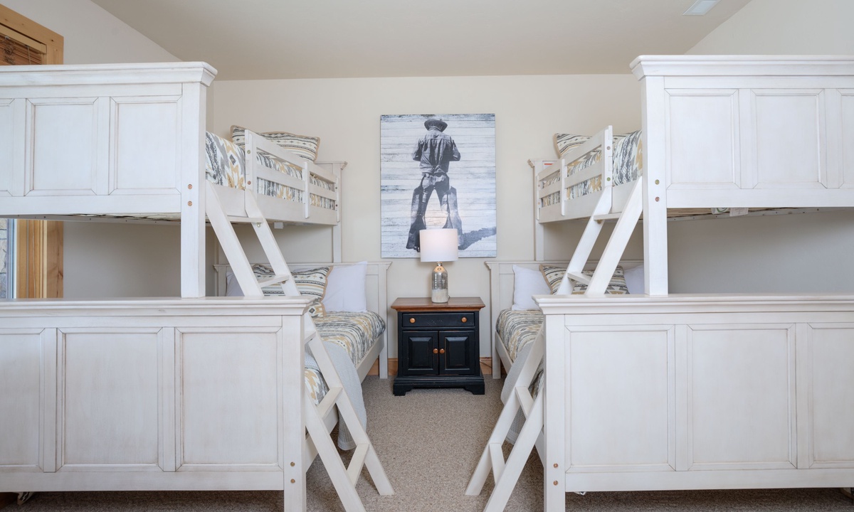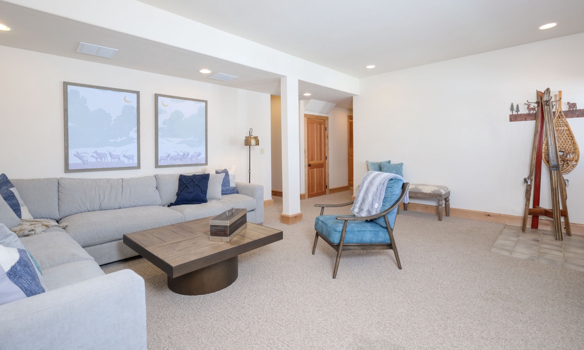 Upstairs in the loft room you’ll find a seating area, small desk (if remote work is needed) and a king en-suite bedroom. Downstairs on the lower level of the home is a bonus family and TV room, a spacious bedroom with two queen bunks and access to a covered deck with a soothing hot tub overlooking the evergreens.