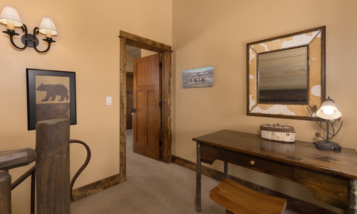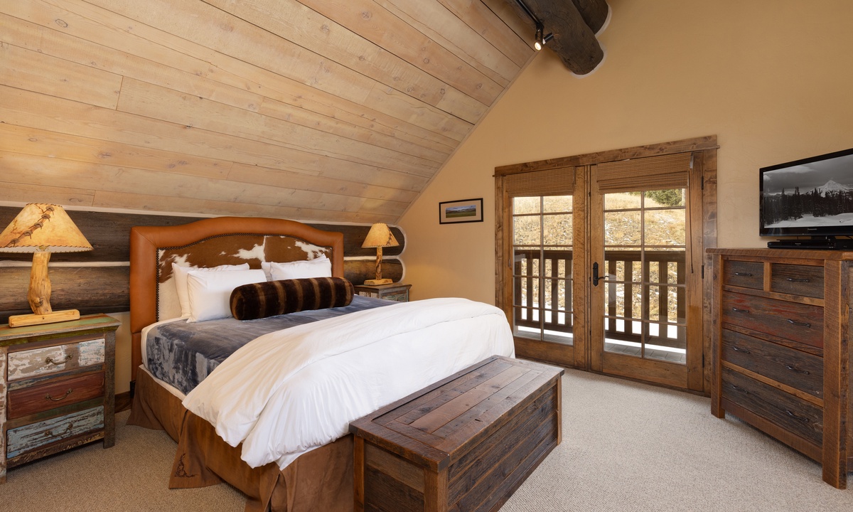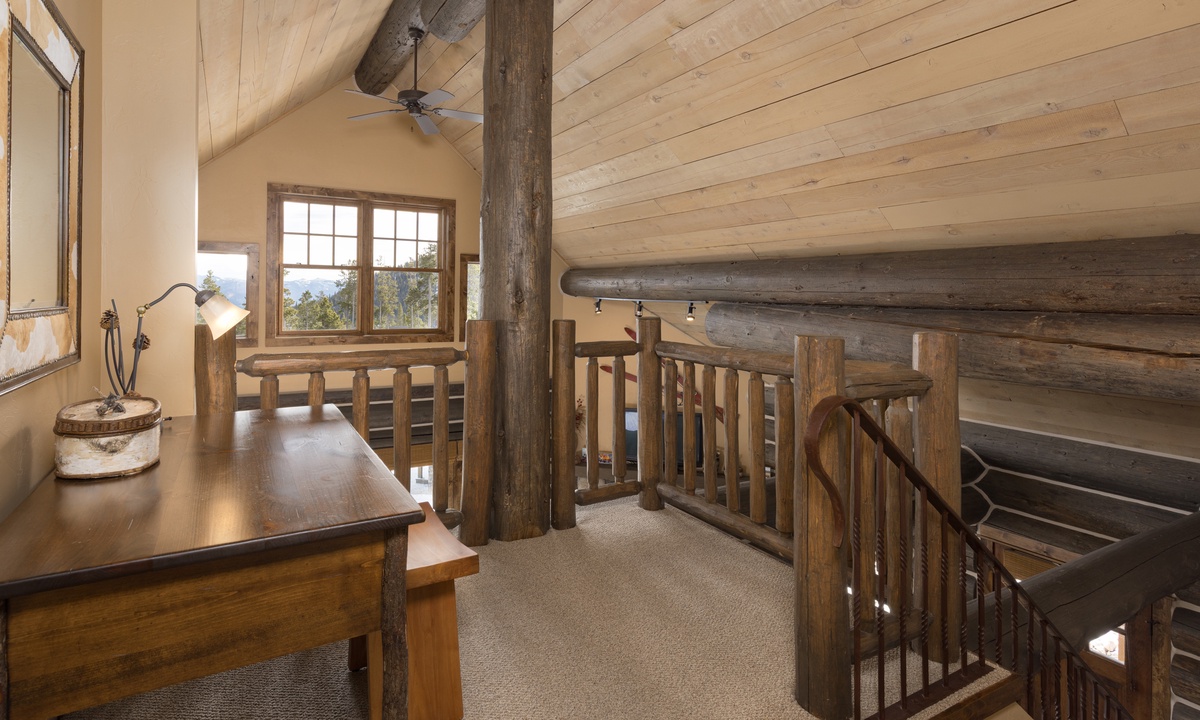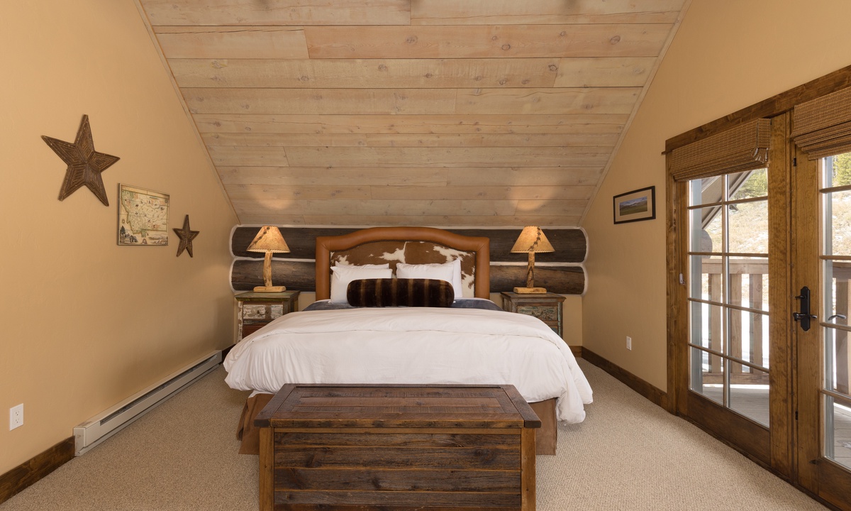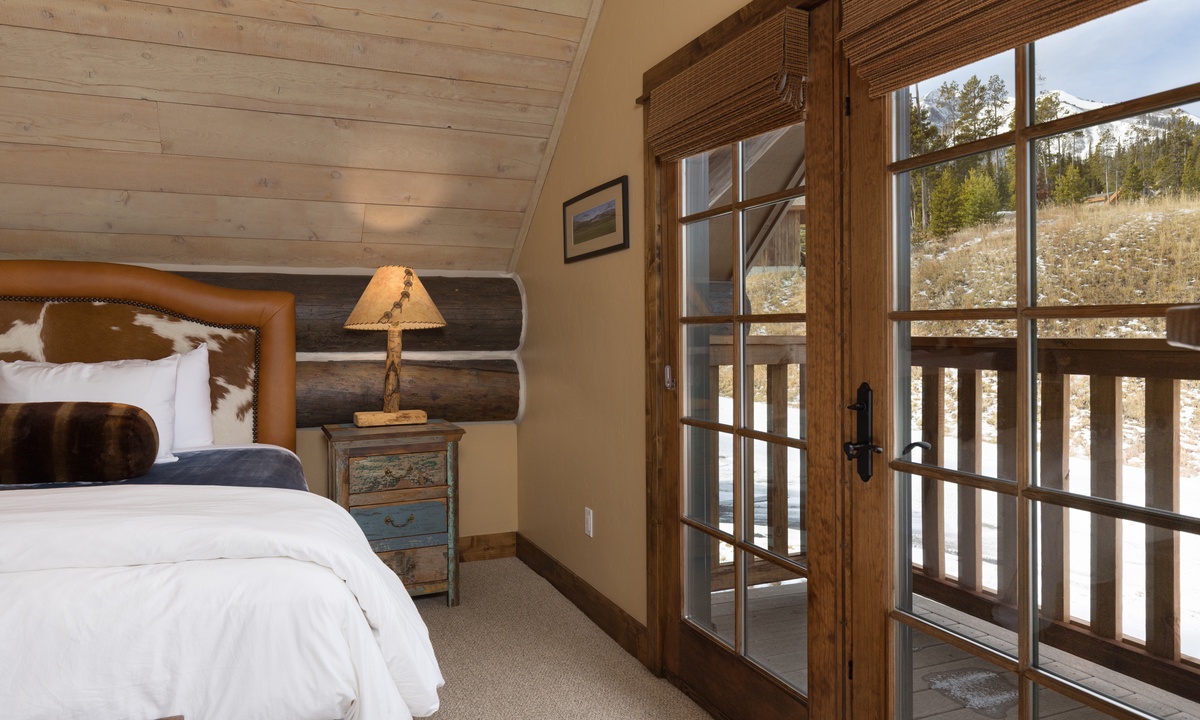 This stylish Big Sky Montana cabin comfortably sleeps 8 guests in 4 bedrooms with a sleeper sofa in the family room for extra guests. The loft level features a work desk and the master king suite with a dressing room, en-suite bathroom and private balcony. On the main level there is a queen room and a twin room sharing a bathroom, with a king bedroom on the lower level. Whether you’re travelling with a large group of friends or family, Manitou 15 offers space, privacy and an easy socially distanced escape in the mountains of Montana.
