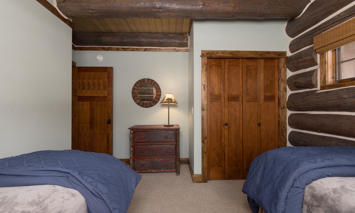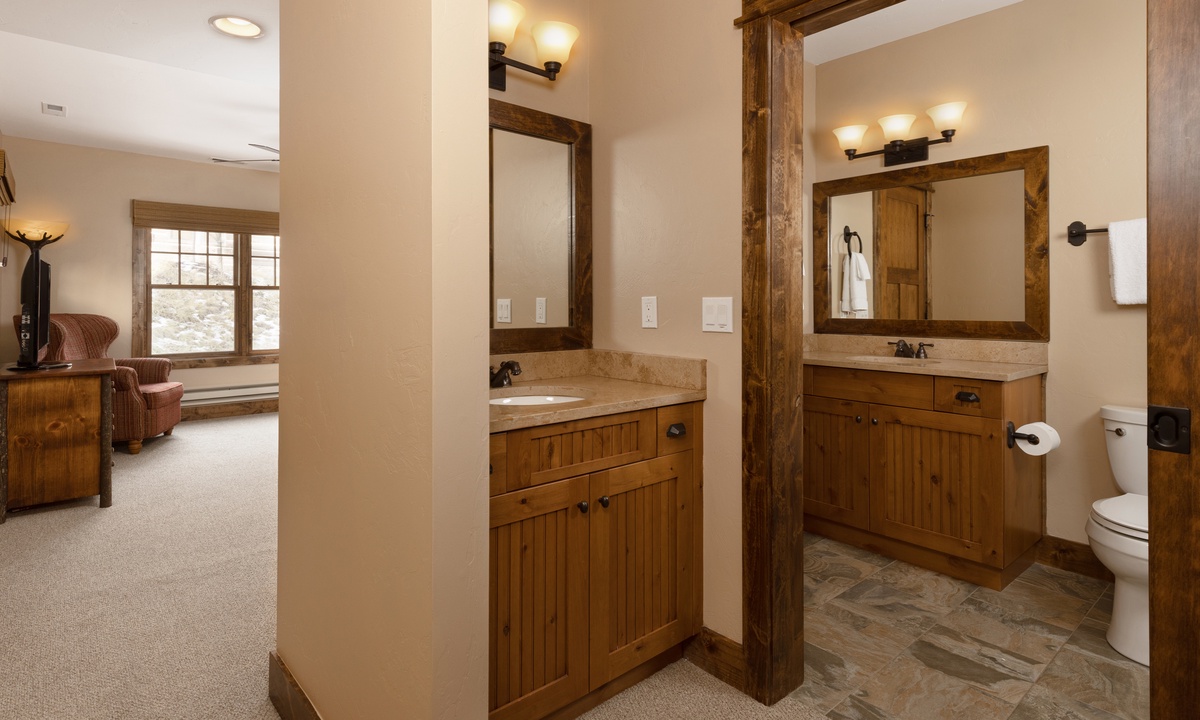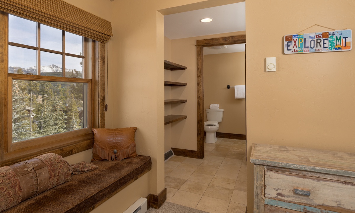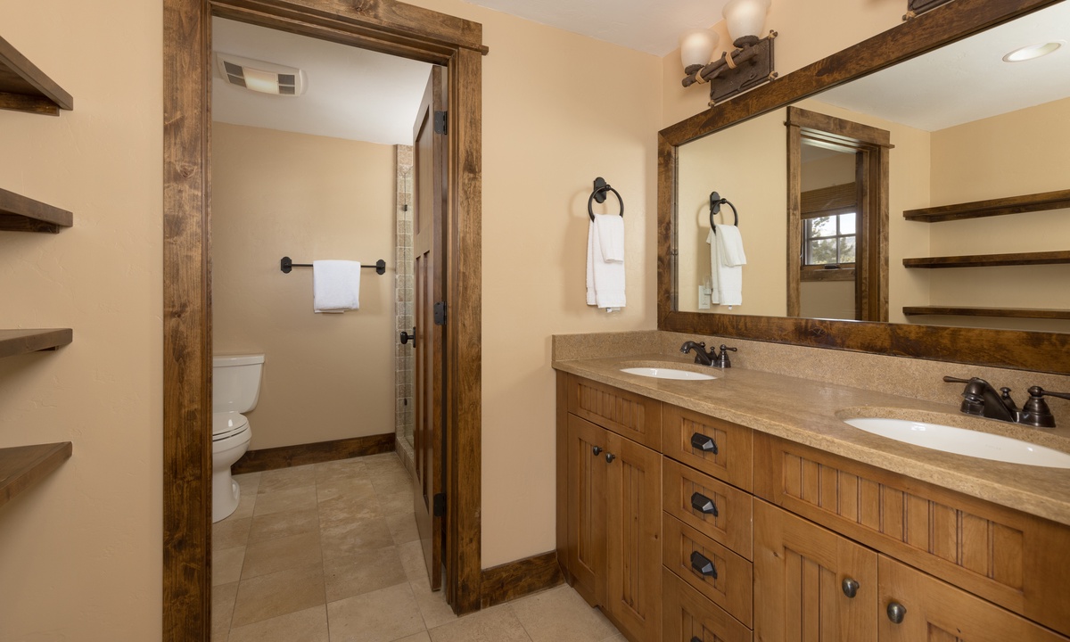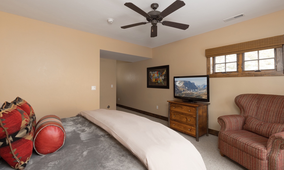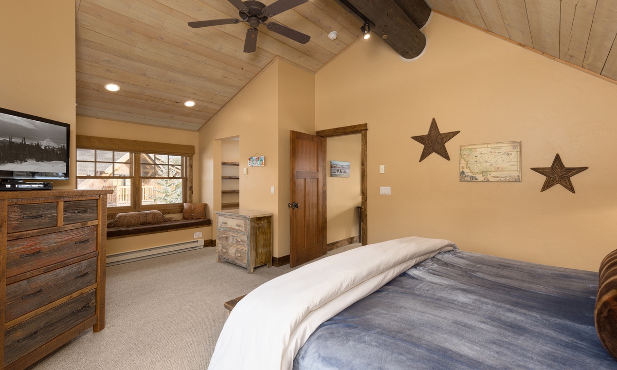 This stylish Big Sky Montana cabin comfortably sleeps 8 guests in 4 bedrooms with a sleeper sofa in the family room for extra guests. The loft level features a work desk and the master king suite with a dressing room, en-suite bathroom and private balcony. On the main level there is a queen room and a twin room sharing a bathroom, with a king bedroom on the lower level. Whether you’re travelling with a large group of friends or family, Manitou 15 offers space, privacy and an easy socially distanced escape in the mountains of Montana.