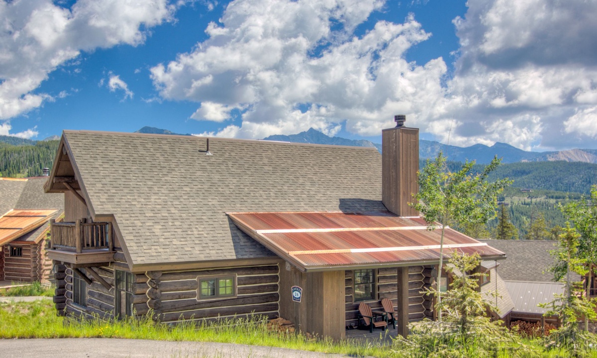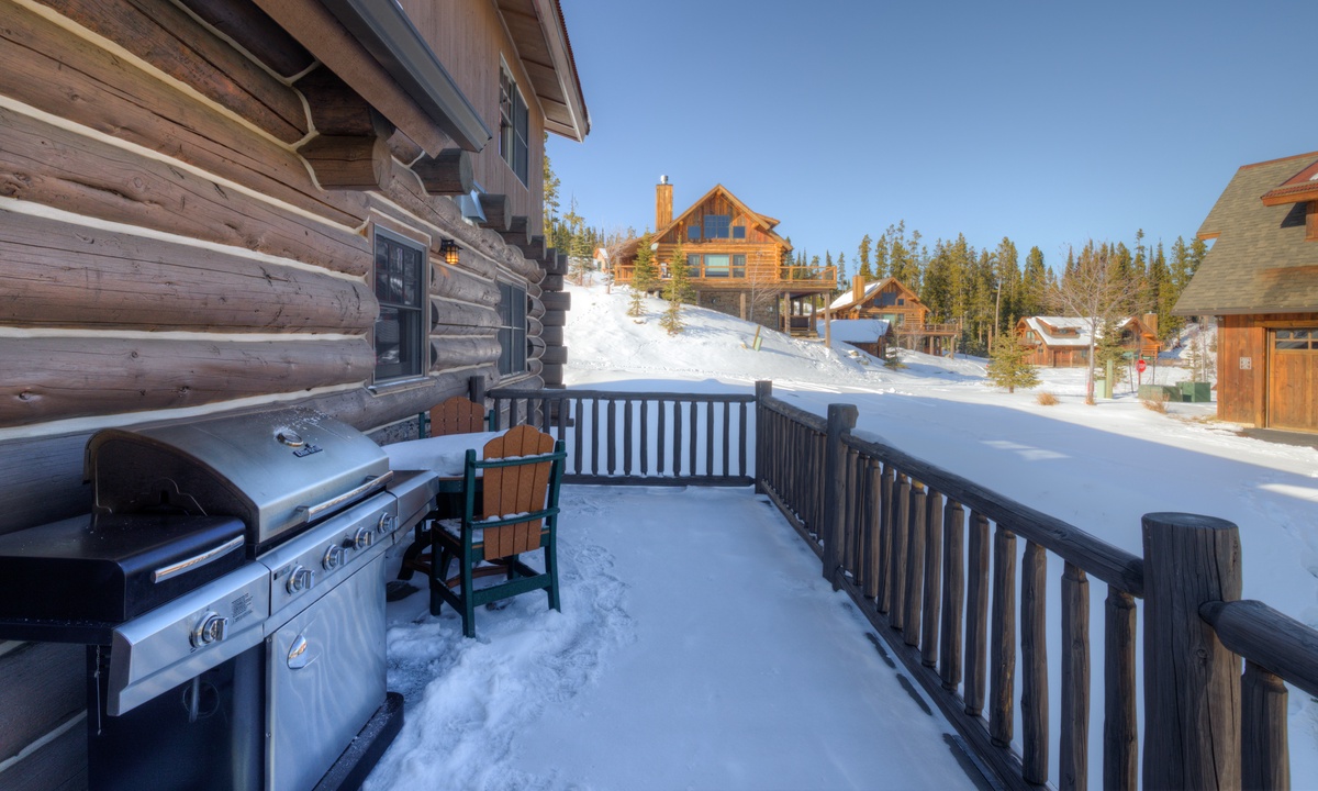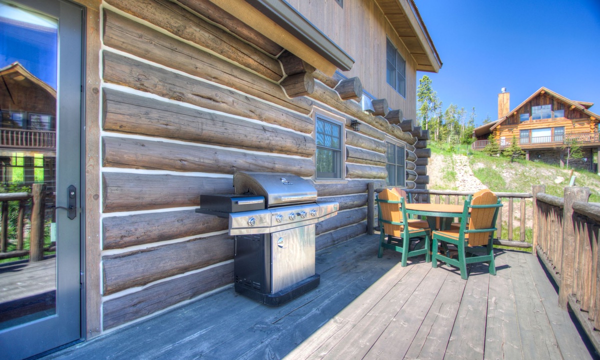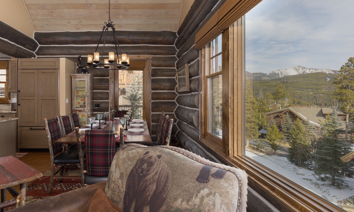 Step into style, comfort and a true mountain cabin vibe when you enter this spacious and inviting Powder Ridge cabin rental. The double volume great room features elegant interiors and rustic enhancements such as log paneling, cathedral ceilings, hardwood floors and stunning exposed timber beams. Entertaining friends and family at home is easy with high-end stainless appliances and modern kitchen amenities, a spacious dining area and a wooden deck with a BBQ grille and outdoor furniture for warmer days, with gorgeous Big Sky views.
