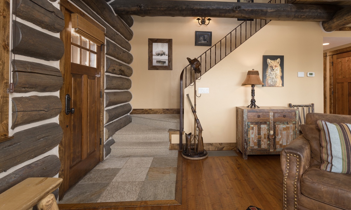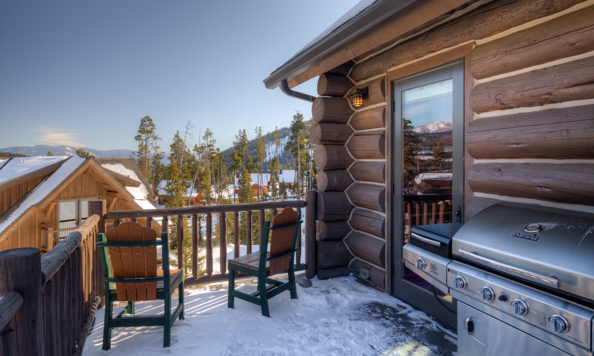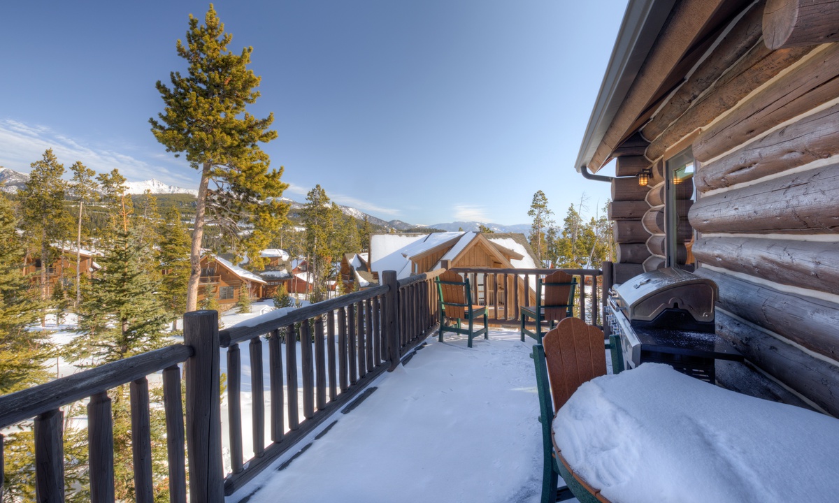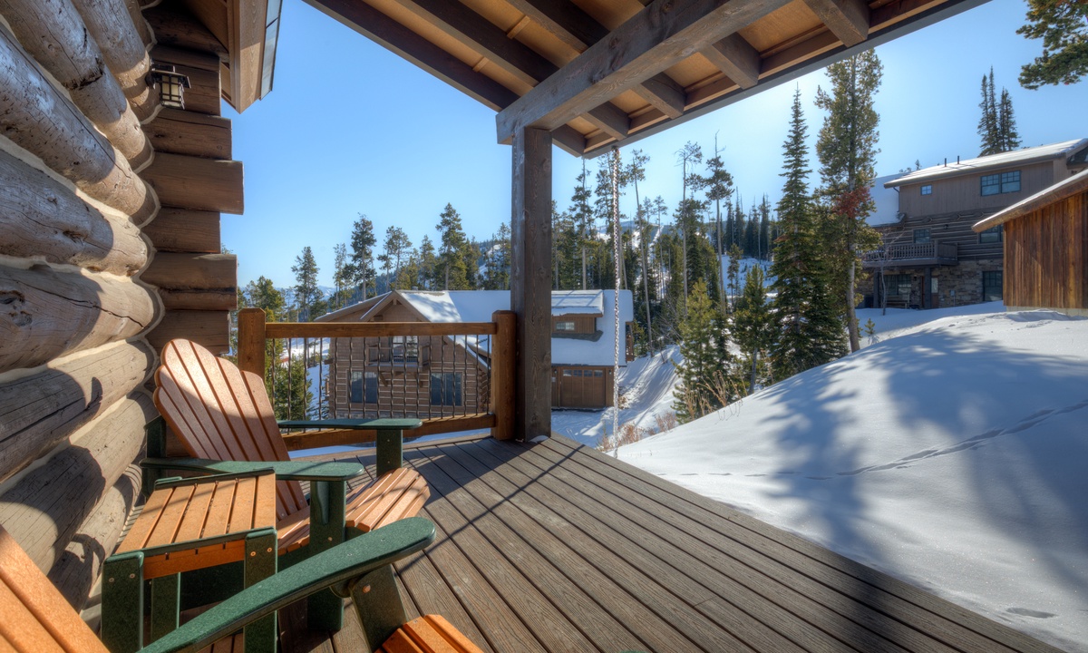 Step into style, comfort and a true mountain cabin vibe when you enter this spacious and inviting Powder Ridge cabin rental. The double volume great room features elegant interiors and rustic enhancements such as log paneling, cathedral ceilings, hardwood floors and stunning exposed timber beams. Entertaining friends and family at home is easy with high-end stainless appliances and modern kitchen amenities, a spacious dining area and a wooden deck with a BBQ grille and outdoor furniture for warmer days, with gorgeous Big Sky views.
